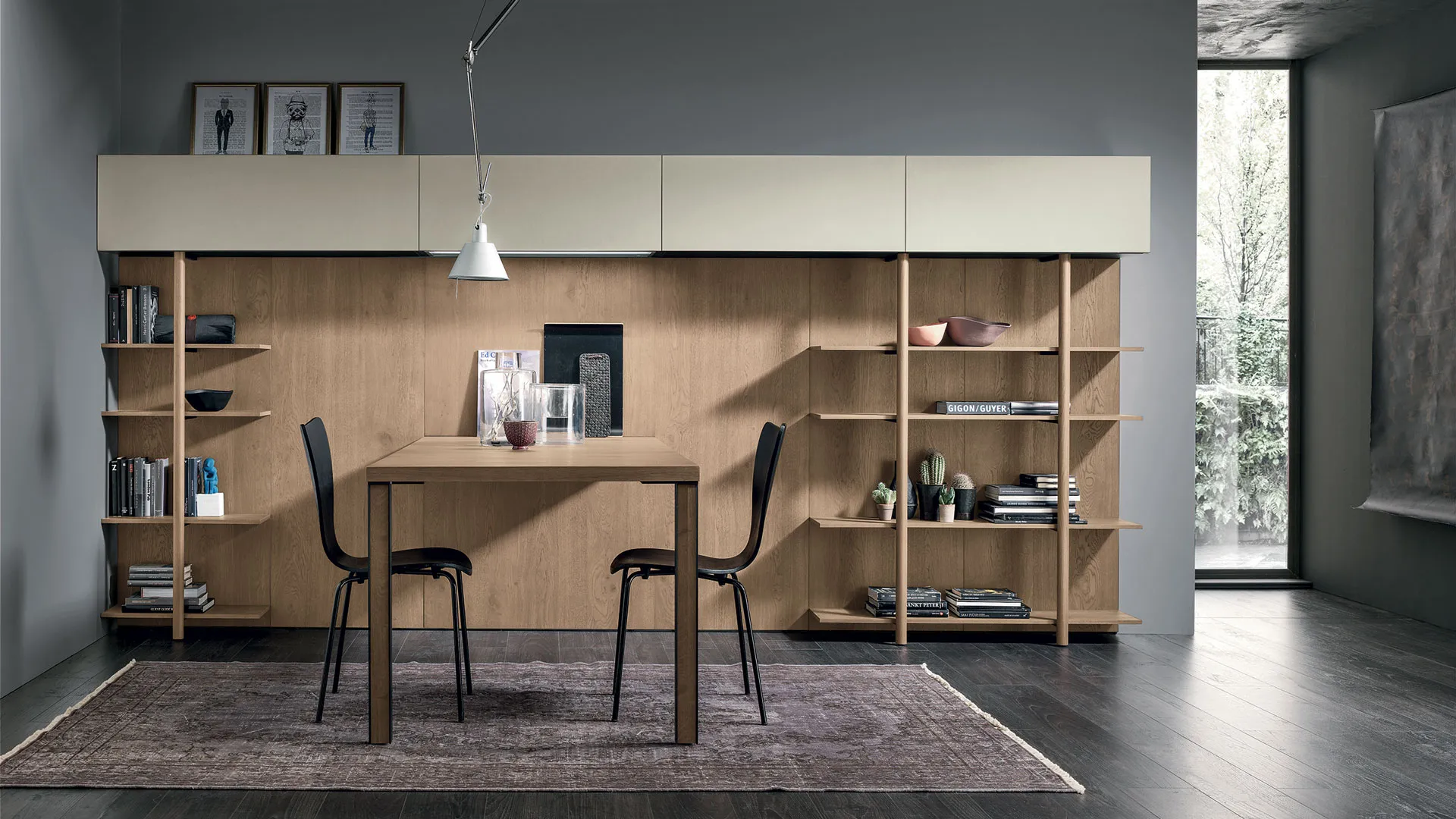 Honey Oak, matt Color Trend Pumice lacquer. Plinth leg in Brushed Black and Honey Oak. The wall paneling with integrated Palo Alto bookcase frames the table and adds a touch of elegance and refinement to the space.